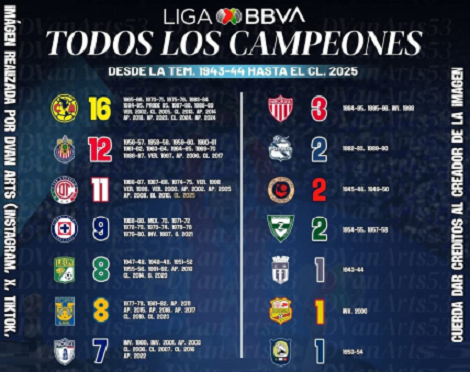 Sin categoría Desde la Temporada 1943-44 se han registrado 24 equipos campeones en el fútbol mexicano; encabeza la lista el América con 16. 14 febrero, 202614 febrero, 2026 maguadam1526 Fuentes: FMF / Liga mX Share this:Haz clic para compartir en Twitter (Se abre en una ventana nueva)Haz clic para compartir en Facebook (Se abre en una ventana nueva) Relacionado