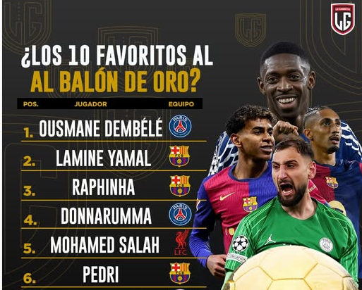 Sports Entre los 10 jugadores favoritos para recibir el Balón de Oro, en la edición del 2025, figura el jovencito Lamine Yamal 26 mayo, 202526 mayo, 2025 maguadam1526 Fuentes: FIFA / UEFA / GOAL Share this:Haz clic para compartir en Twitter (Se abre en una ventana nueva)Haz clic para compartir en Facebook (Se abre en una ventana nueva) Relacionado