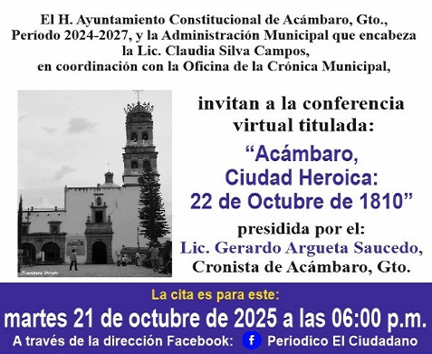 Acámbaro Invitan a conferencia virtual sobre Hidalgo, este martes 21 de octubre de 2025, a las 6 de la tarde 20 octubre, 202520 octubre, 2025 maguadam1526 Fuente: Gobierno de Acámbaro, Gto. Share this:Haz clic para compartir en Twitter (Se abre en una ventana nueva)Haz clic para compartir en Facebook (Se abre en una ventana nueva) Relacionado