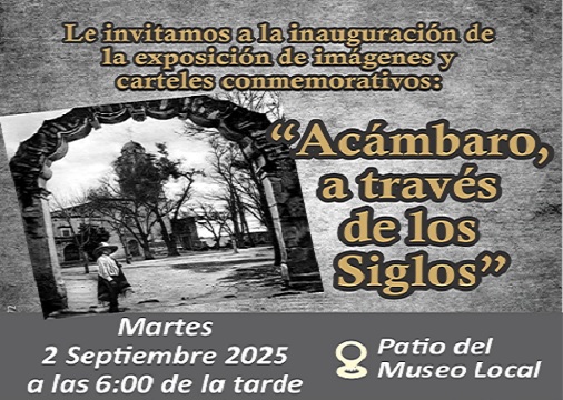 Acámbaro Invitan a interesantes Exposiciones de Fotografía Antigua y Carteles sobre la historia regional de Acámbaro, Gto. 1 septiembre, 202530 agosto, 2025 maguadam1526 Fuentes: Gobierno de Acámbaro, Gto. / Museo “Dr. Luis Mota Maciel” Share this:Haz clic para compartir en Twitter (Se abre en una ventana nueva)Haz clic para compartir en Facebook (Se abre en una ventana nueva) Relacionado