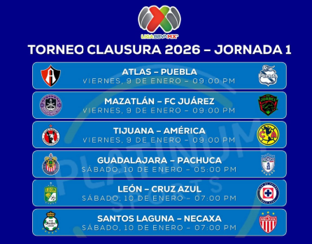 Acámbaro La Jornada 1 de la Liga MX, correspondiente al Torneo de Clausura 2026, inicia el 9 de enero de 2026 3 enero, 20263 enero, 2026 maguadam1526 Fuentes: FMF / FIFA Share this:Haz clic para compartir en Twitter (Se abre en una ventana nueva)Haz clic para compartir en Facebook (Se abre en una ventana nueva) Relacionado