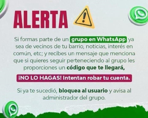 Acámbaro Se advierte que el robo de cuenta de WhatsApp es real, por ello, es conveniente bloquear a usuarios sospechosos 19 junio, 202519 junio, 2025 maguadam1526 Fuente: Redes Sociales Share this:Haz clic para compartir en Twitter (Se abre en una ventana nueva)Haz clic para compartir en Facebook (Se abre en una ventana nueva) Relacionado