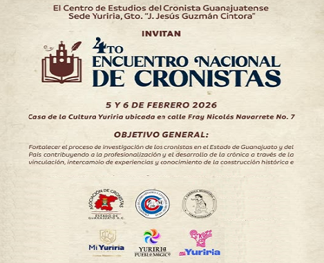 Acámbaro Crónica Ya todo está listo para el 4to Encuentro Nacional de Cronistas 2026. Es el 5 y 6 de febrero en la ciudad de Yuriria, Gto. 1 febrero, 202630 enero, 2026 maguadam1526 Fuentes: Crónica Municipal y Ayuntamiento de Yuriria, Gto. Share this:Haz clic para compartir en Twitter (Se abre en una ventana nueva)Haz clic para compartir en Facebook (Se abre en una ventana nueva) Relacionado